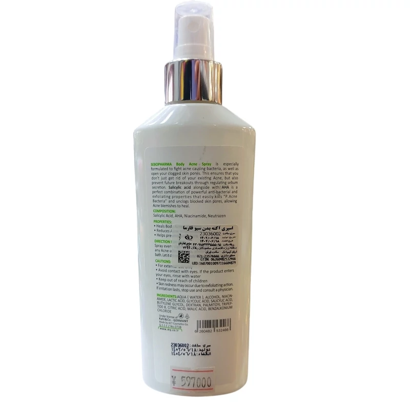 بروز آکنه و جوش روی پوستهای چرب و مختلط بسیار شایع هست . اسپری آکنه بدن سبوفارما برای مبارزه با باکتری عامل آکنه و باز نمودن منافذ مسدود پوست طراحی شده است. استفاده از این محصول نه تنها به رفع آکنه بدن کمک میکند، بلکه با کنترل ترشح چربی پوست، از به وجود آمدن آکنههای بعدی نیز پیشگیری به عمل میآورد. استفاده از اسید سالیسیلیک در کنار AHA در این محصول، ترکیبی از خواص آنتی باکتریال و لایه برداری پوست را که جهت رفع آکنهها به آن نیاز است، فراهم آورده است. نوترازن موجود در این اسپری نیز به آرامش پوست و رفع التهاب آکنهها کمک میکند.