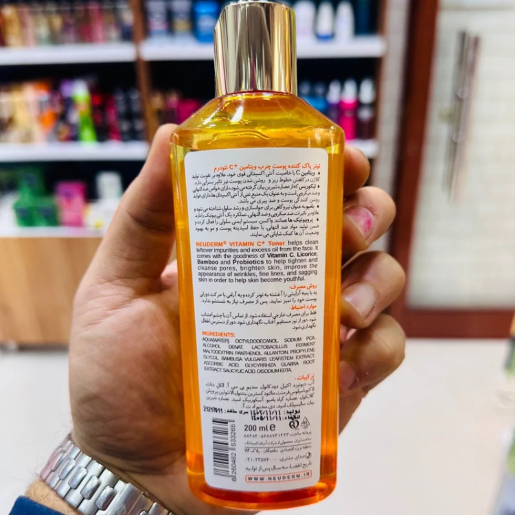 تونر پاک کننده پوست چرب ویتامین سی C پلاس نئودرم ضمن متعادل سازی چربی پوست، در روشن و شفاف سازی پوست صورت و پیشگیری از چین و چروکهای پوستی موثر است. پروبیوتیک موجود در این تونر پاک کننده، همانند واکسن عمل کرده و ضمن فعال سازی سیستم ایمنى و تولید مواد ضد التهابى، به بهبود وضعیت پوست کمک شایانى مىکند. تونر پاک کننده پوست چرب ویتامین سی پلاس C نئودرم، برای افراد دارای پوست چرب و مستعد آکنه بوده و به پاکسازی آلودگیها و چربیهای اضافی از روی پوست کمک شایانی میکند. این تونر حاوی عصاره شیرین بیان، بامبو، نیاسینامید است تا ضمن پاکسازی موثر پوست، منجر به کوچک کردن منافذ باز پوست گردد. حجم این محصول 200 میلی لیتر است. و راستی بعد از استفاده نیاز به اب کشی نداره