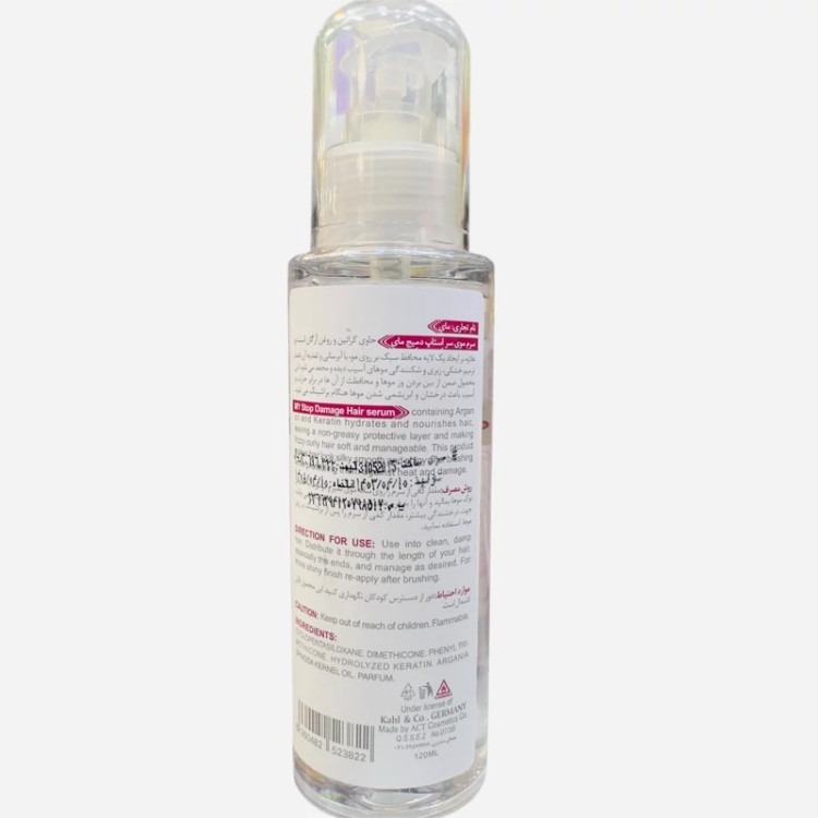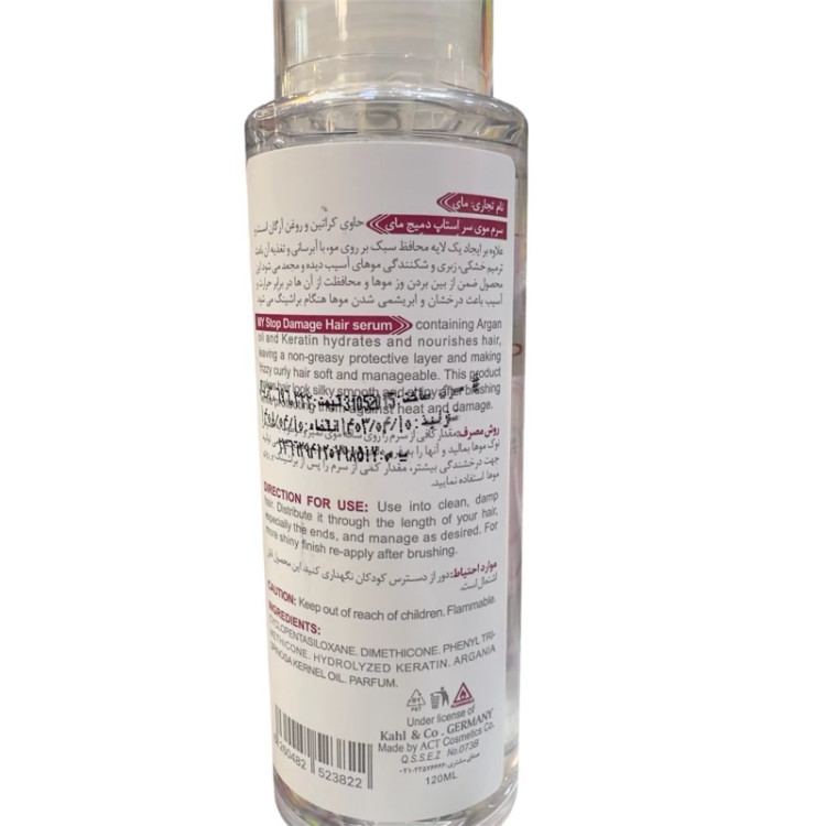 سرم موی سر استاپ دمیج مای در این سرم به طور کلی از دو ترکیب استفاده شده آرگان و کاراتین این ترکیب علاوه بر ایجاد یک لایحه محافظ سبک روی مو برای مواقع اتو کشی و سشوار ابرسانی و موجب تغذیه مو میشود و خشکی مو رو ترمیم میکنه و زبری و خشکی مو رو از بین میبره ، این سرم یه محصول فوق العاده در امر از بین بردن وزی مو هستش . مو های درخشان و ابریشمی بعد از عمل براشینگ به ارمغان میاره